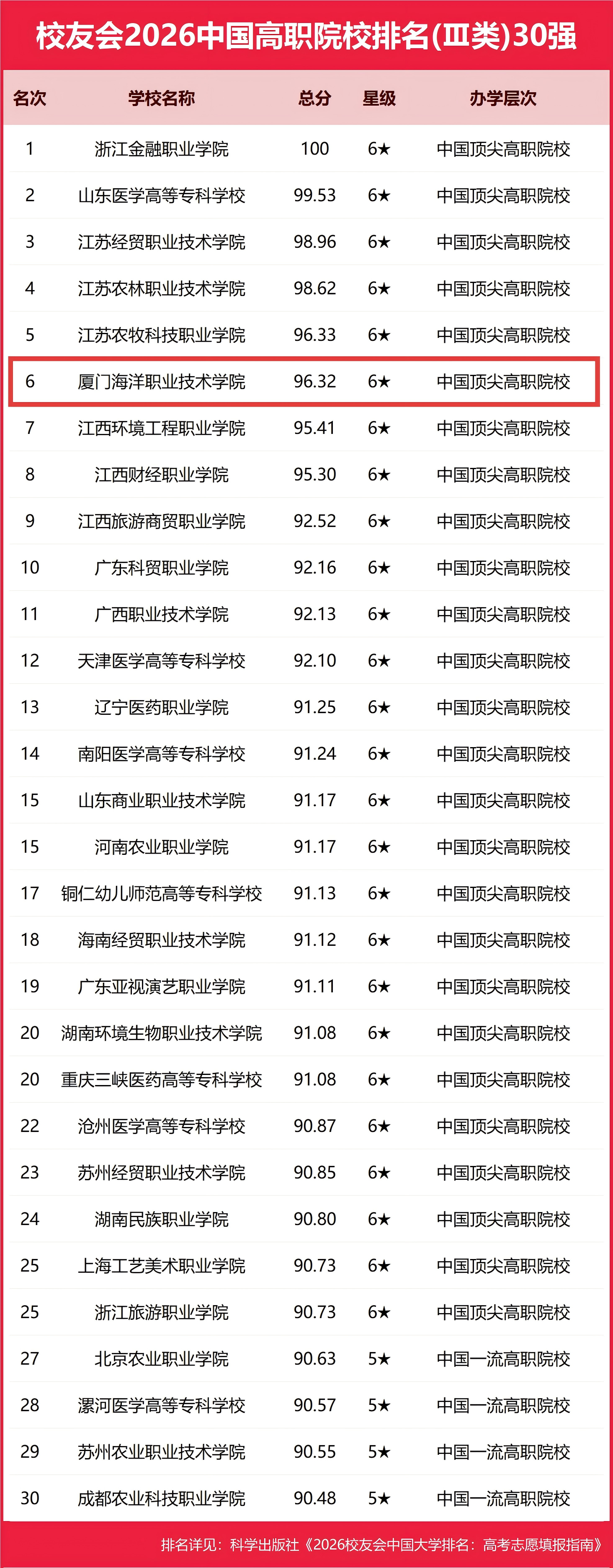 近日,全国第三方大学评价研究机构艾瑞深校友会网(Cuaa.net)正式发布校友会2026中国大学排名,我校以96.32分的总分位列2026全国高职院校(Ⅲ类)第6位,排名位次连续两年跻身“中国顶尖高职院校”全国前六,连续六年位列福建省第一。与此同时,我校还位列校友会2026中国海洋类高职院校排名榜首。