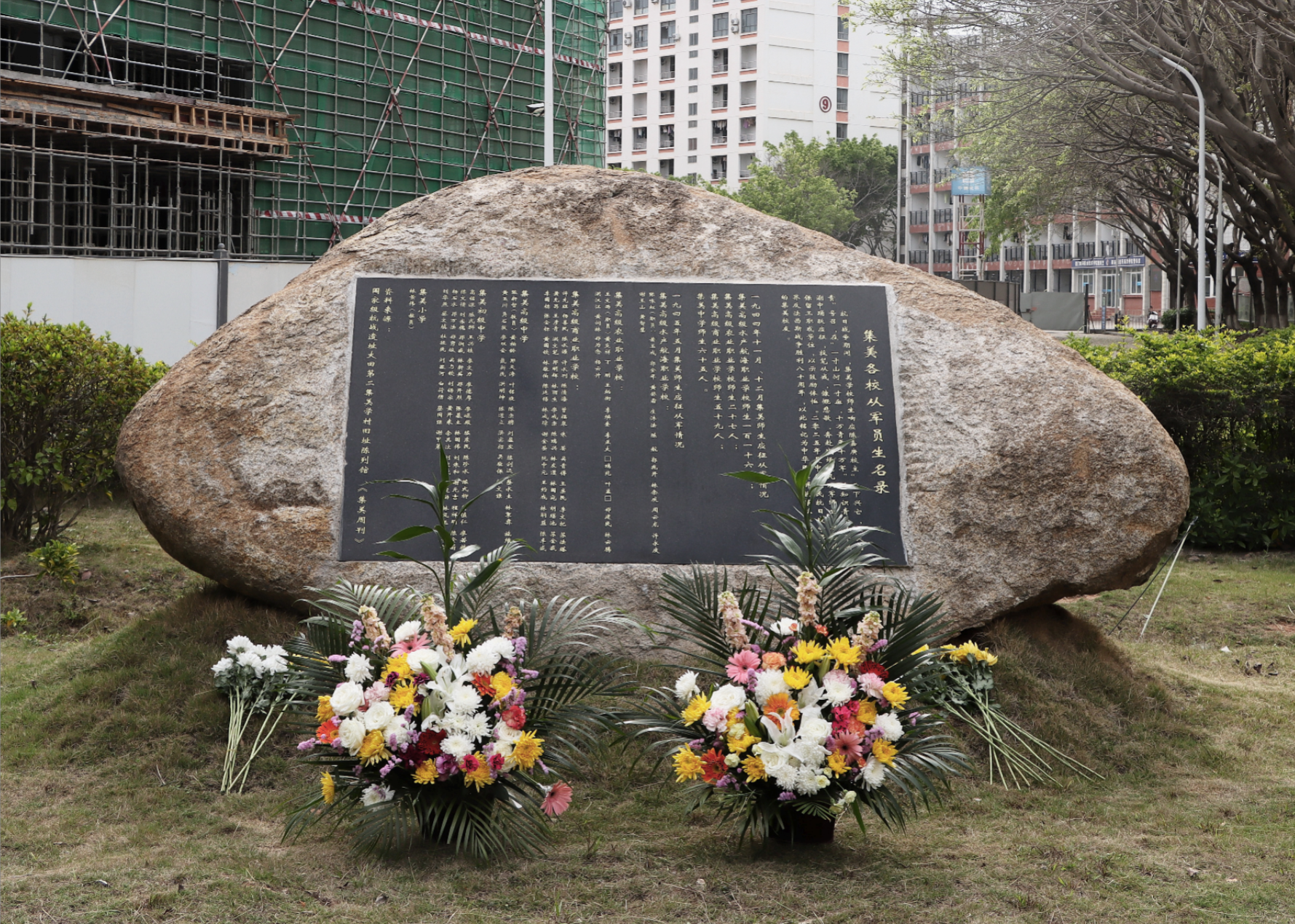 上午9时,缅怀活动在庄重肃穆的氛围中拉开帷幕。校党委书记陈一端、校党委副书记缪雄平代表学校依次向《嘉庚讲学》铜雕群像、集美各校师生从军名录石刻敬献花篮。随后,垂首默哀、行鞠躬礼,深切缅怀校主陈嘉庚先生及集美各校从军师生,表达崇高敬意。