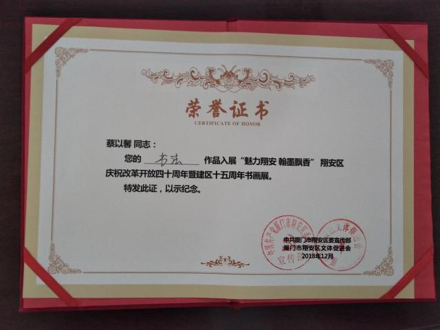 “‘魅力翔安 翰墨飘香’翔安区庆祝改革开放四十周年暨建区十五周年书画展”于2019年1月期间在翔安澳头超旷美术馆展出。此次展出的包括书法、国画、漆画、油画、水彩等作品共约160幅,我院校友会共选送本校师生、校友作品5幅参加征集活动,最终蔡以馨校友最终入选。我院校友会长期支持校友在书法、摄影等文化艺术领域进行探索,建立平台展开交流,举办活动共同丰富校园和校友业余生活。2019年我院校友会拟策划举办校友书法交流会,进一步促进校友之间的艺术活动。