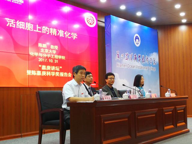 10月31日上午,2017年度“嘉庚讲坛”暨陈嘉庚科学奖报告会在我院翔安校区学术交流中心隆重举行。2016年度陈嘉庚青年科学奖获奖者、北京大学化学与分子工程学院博士生导师、北京大学前沿交叉学科研究院副院长,北大-清华生命科学联合中心高级研究员陈鹏教授莅临我院作专题报告。中国科学院学部工作局、陈嘉庚科学奖基金会办公室高级业务主管王小曼女士,集美学校委员会副主任、集美校友总会会长、陈嘉庚纪念馆馆长陈呈,学院陈昌萍院长、汤忠民副书记等出席报告会。报告会由陈昌萍院长主持。