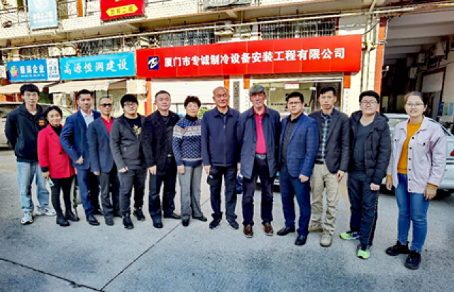 随后,慰问团一行来到厦门市专诚制冷设备安装工程有限公司,拜访公司彭胜展董事长。彭董是制冷771班校友,福建省特种设备标准委员会委员,福建省制冷学会理事、厦门市制冷学会常务理事、厦门市制冷空调协会会长。国家技术标准《氨制冷系统安装工程施工及验收规范》SBJ12-2011编审专家,厦门市翔安区应急管理局安全专家组成员,福建海洋行业职业教育指导委员空调技术指导委员会校外专家。他先后承担了厦门市制冷工初级、中级、高级和技师的教学工作,培养了近300名制冷技工,被授予“资深制冷工程师”荣誉。所管理的公司多次被评为“行业优秀企业”、“一带一路先锋”、“行业标杆企业”。获学院2020年度“优秀校友”。