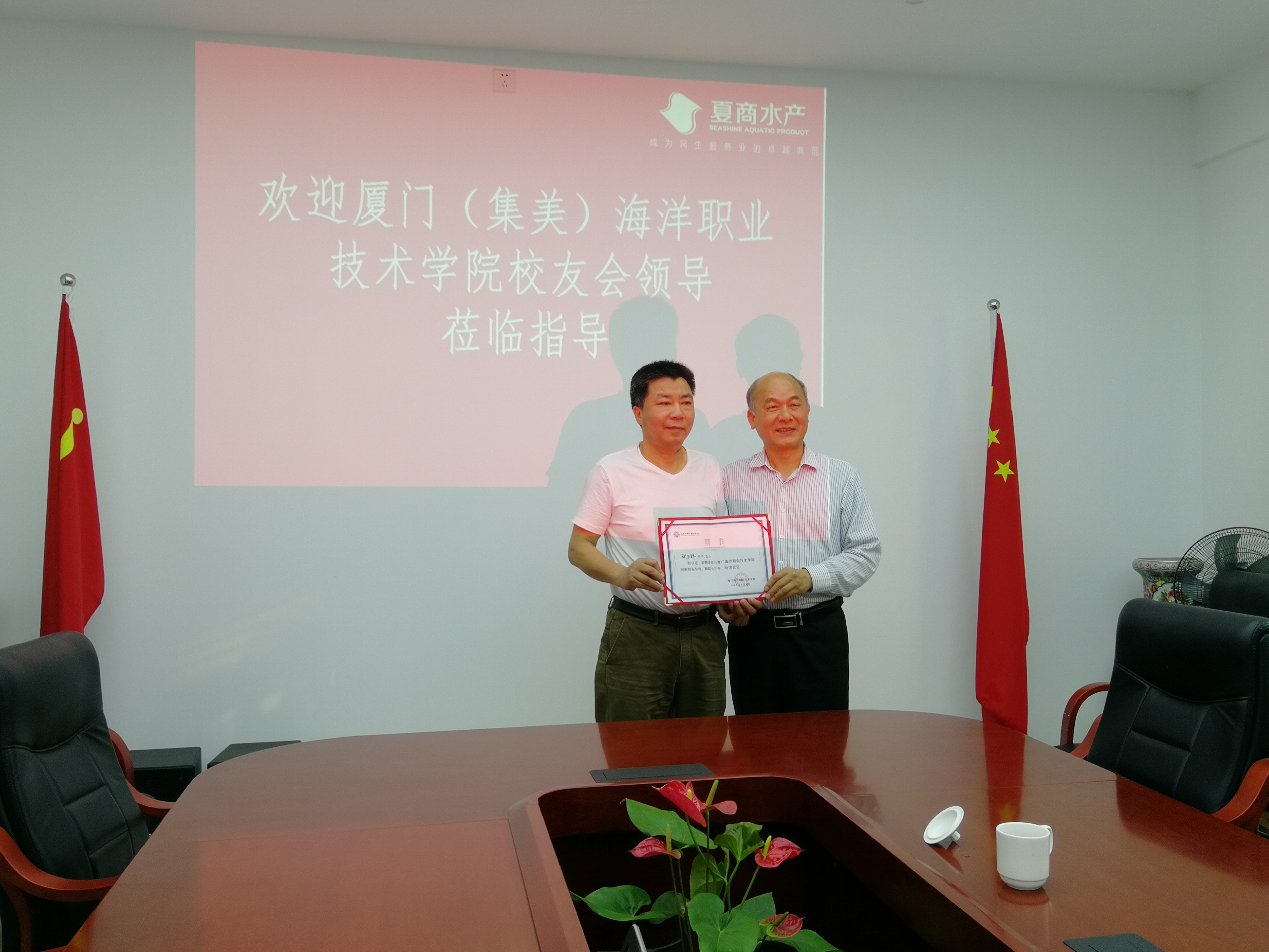 汤忠民一行参观了夏商水产集团厦门闽台中心渔港,详细了解了企业经营、校企合作、毕业生实习就业、校友工作等情况,就校企共建学生创新创业实践基地、人才培养模式创新等方面与校友进行深入交流,同时聘请张亚辉校友为我校创新创业导师。