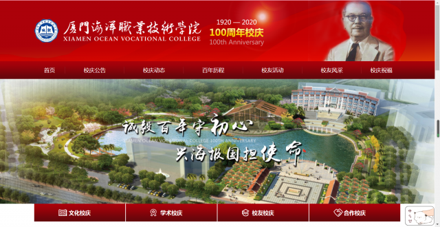 今年10月21日,我院将迎来百年华诞。“厦门海洋职业技术学院100周年校庆”专题网站于近日上线试运行。该网站为我院周年校庆活动官方网站,由学院校庆办负责相关运营。网站主要设立了校庆公告、校庆动态、百年历程、校友活动、校友风采、校友祝福等栏目,旨在全面反映校庆活动动态,展示学院100周年发展的巨大成就。