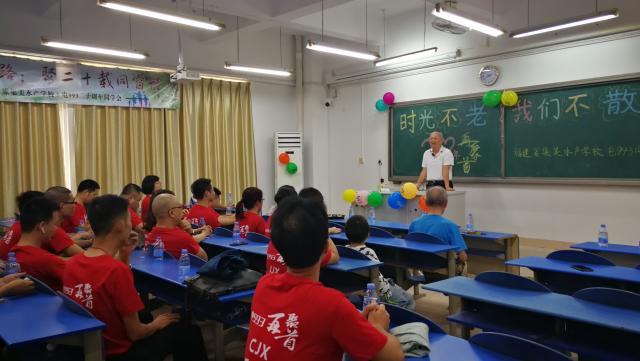 在教室里,校友们用彩色条幅和五颜六色的气球把教室装饰一新,宣传委员拿出看家绝活,再现当年班级黑板报的功力,写出大家20年来的心声“时光不老,我们不散”。从开始的签名簿留言,到向老师献花,教室里充满了浓浓的情谊。